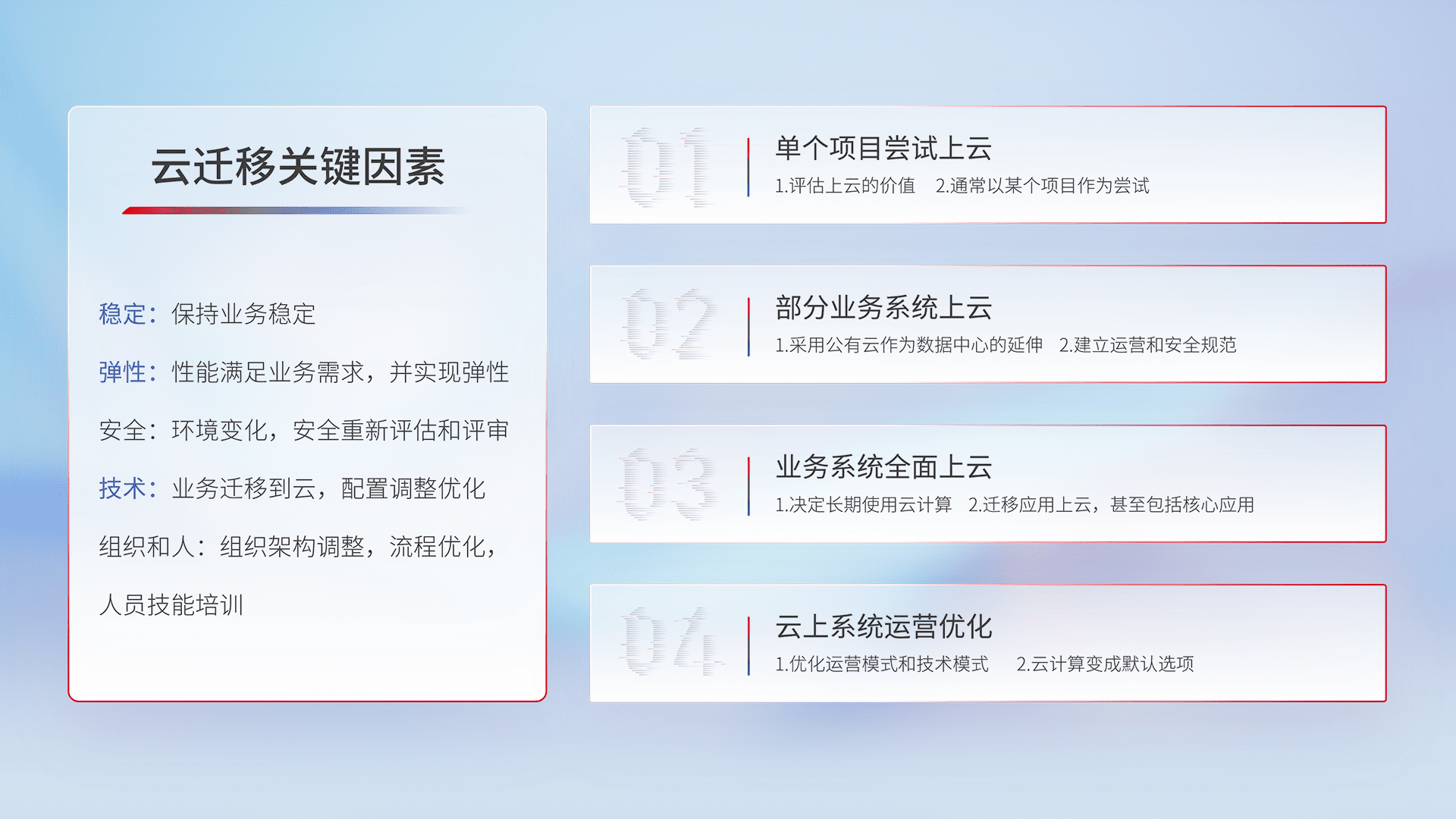 结合实际业务,,,,从规划设计、、、、云平台选型、、、云原生改造、、、、数据迁移、、集成交付,,,迁移全过程为客户识别最佳上云路径,,做好风险识别管理,,设计网络架构、、、身份权限、、安全审计合规、、、操作审计、、、日志审计、、、监控告警策略、、、多站点容灾设计等,,,,对云上基础设施进行整体规划,,,提升IT治理水平,,以满足弹性、、、、高可用、、、高性能的需求。。。