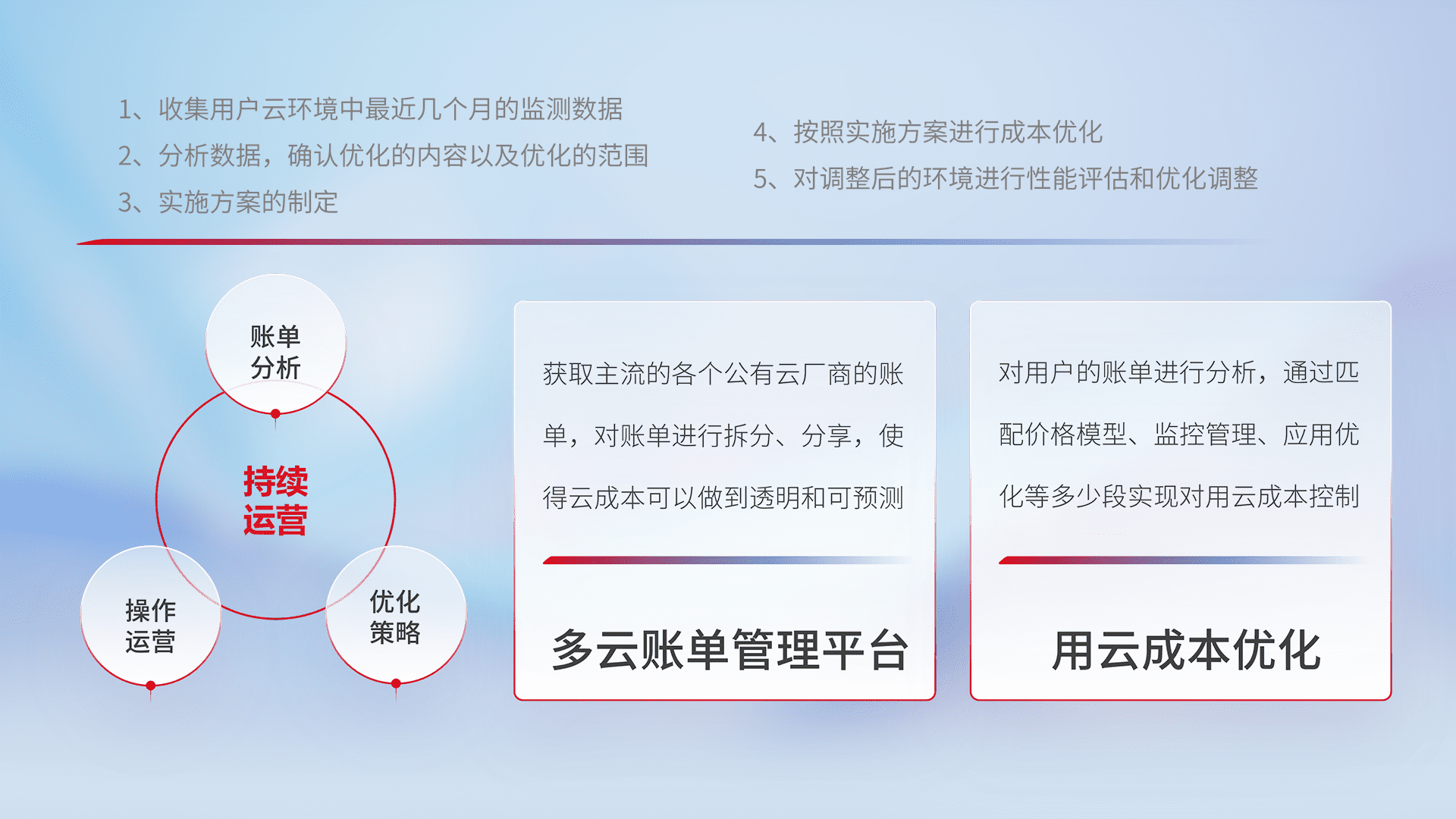 通过多云纳管,,,,以统一的资源数据模型把客户的云资源进行抽象和封装,,,,进而实现对多云资源的统一操作,,,,保障云资源管理的可靠性、、、稳定性与可用性。。。量身定制化运维内容,,,配置、、开发运维、、、、补丁管理、、、备份、、、、监控、、、、认证和访问管理、、、、审计和日常巡检等,,,,保障在用云过程中的可靠度,,,稳定度以及高可用率。。。。